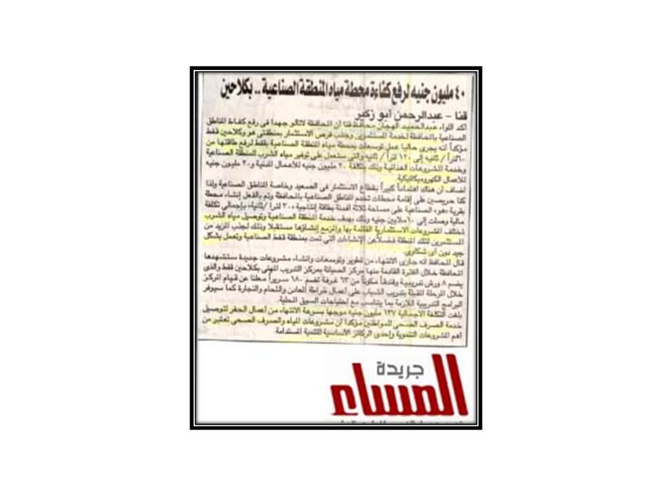 40 مليون جنية لرفع كفاءة محطة مياه المنطقة الصناعية …بكلاحين بمحافظة قنا …