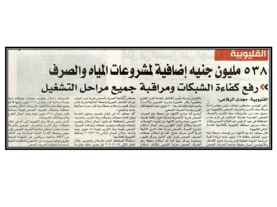 538 مليون جنية اضافية لمشروعات المياه والصرف ..رفع كفاءة الشبكات ومراقبة جميع مراحل التشغيل