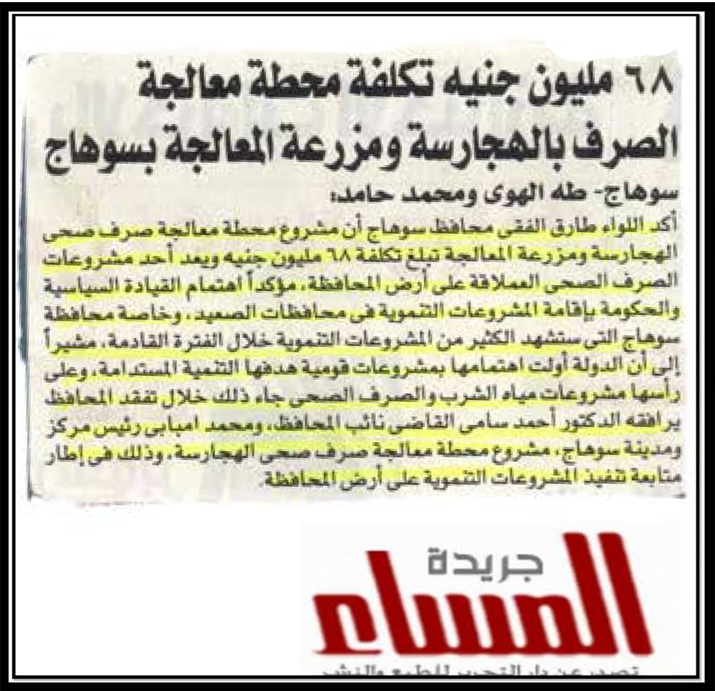 68 مليون جنية تكلفة محطة معالجة الصرف بالهجارسة ومزرعة المعالجة بسوهاج .