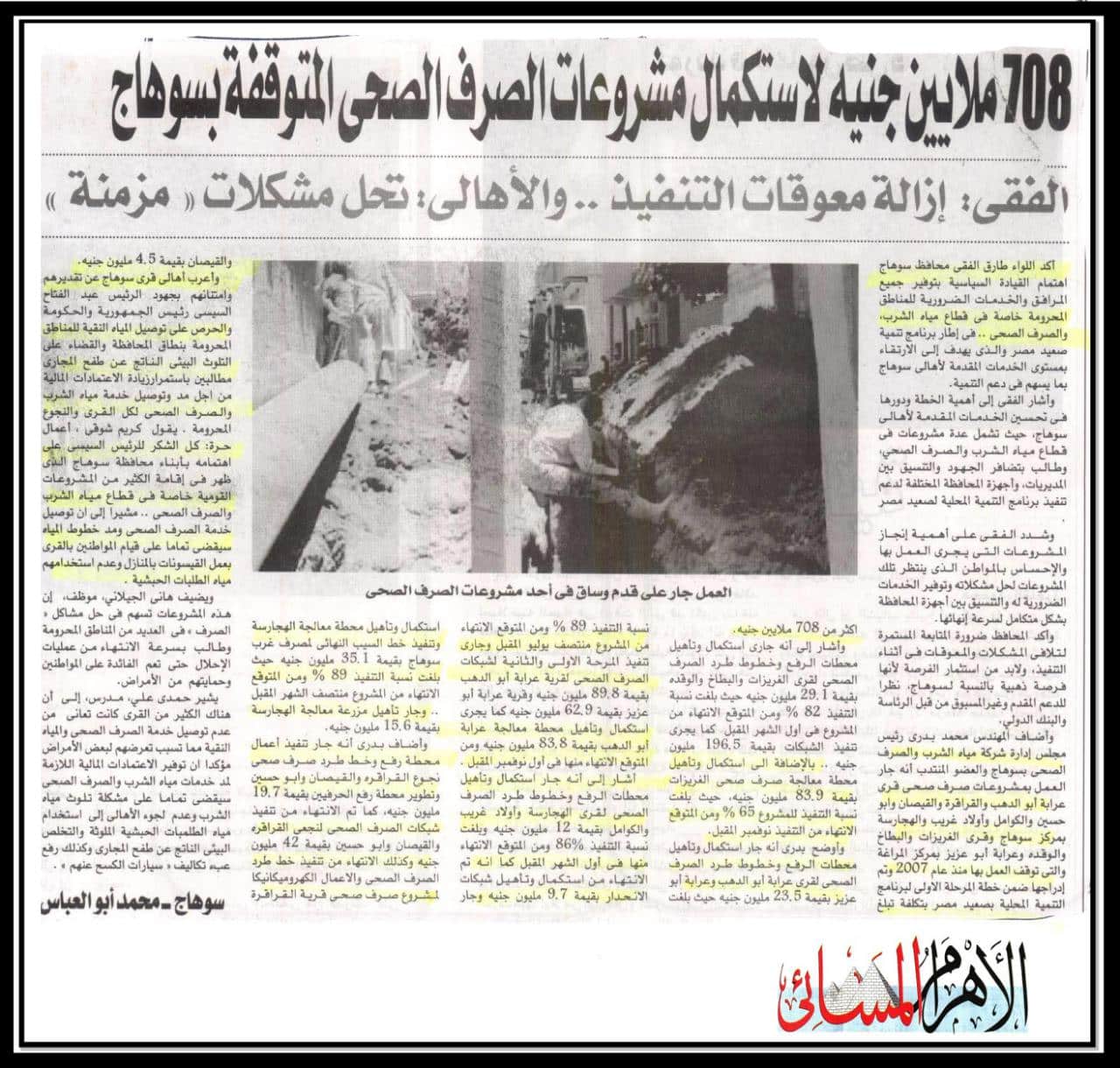 708 ملايين جنية لاستكمال مشروعات الصرف الصحي المتوقفة بسوهاج .