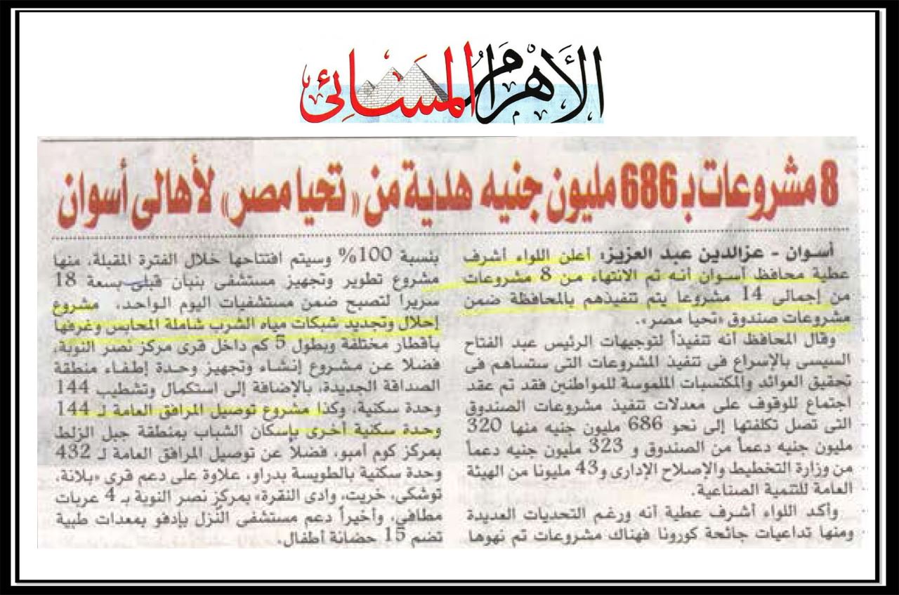 8 مشروعات 686 مليون جنية هدية من ” تحيا مصر ” لاهالي أسوان .