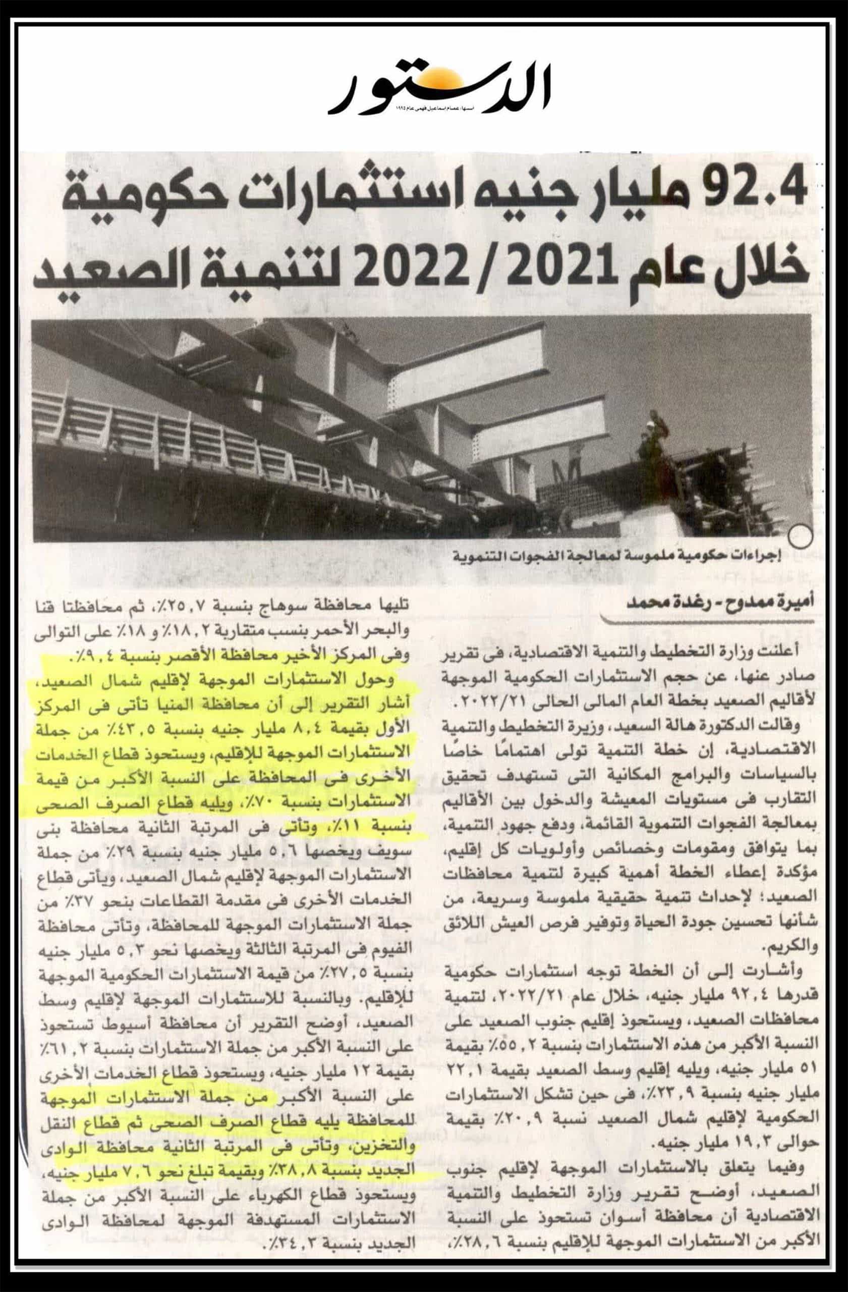 92.4 مليار جنية استثمارات حكومية خلال 2021/2022 لتنمية الصعيد