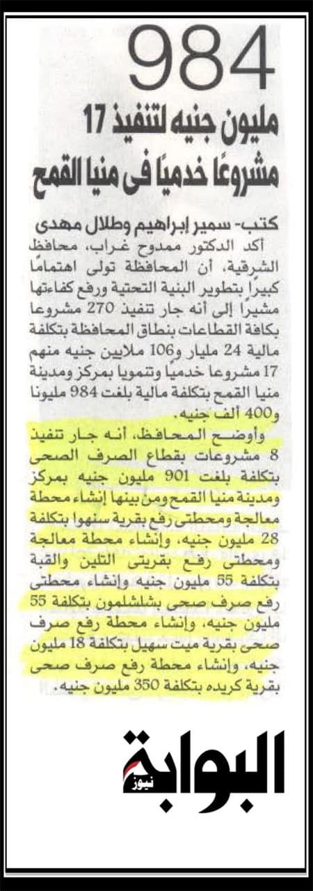 984 مليون جنية لتنفيذ 17 مشروعا خدميا في منيا القمح .